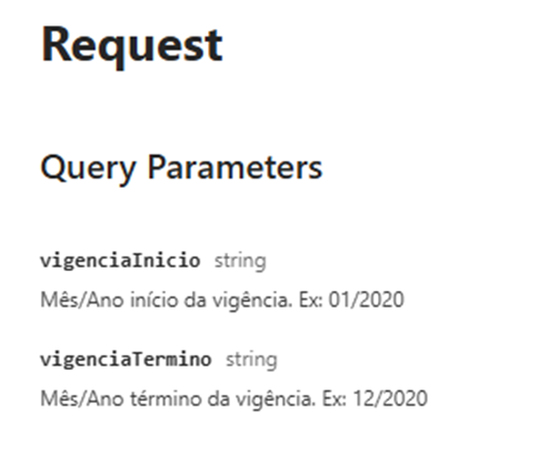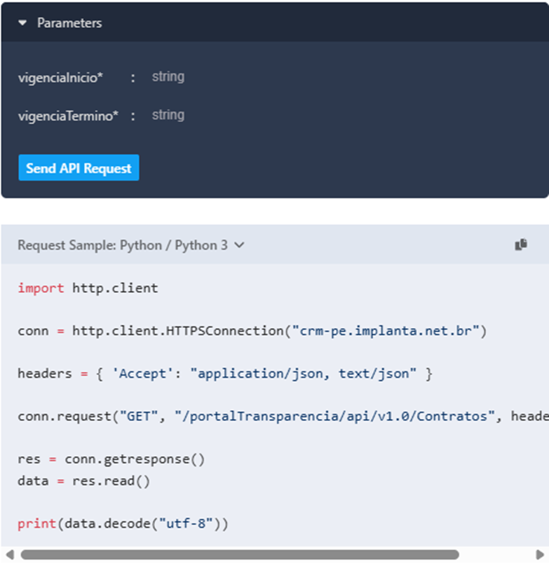 4. Neste exemplo, digite o período de vigência desejado, clique em “Send API Request” para visualizar os dados ou escolha a linguagem para gerar o código a ser inserido na sua aplicação.